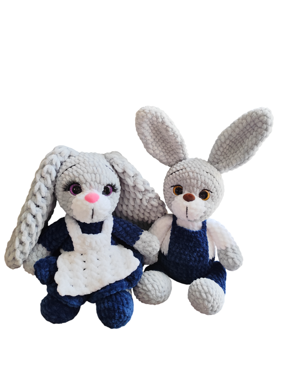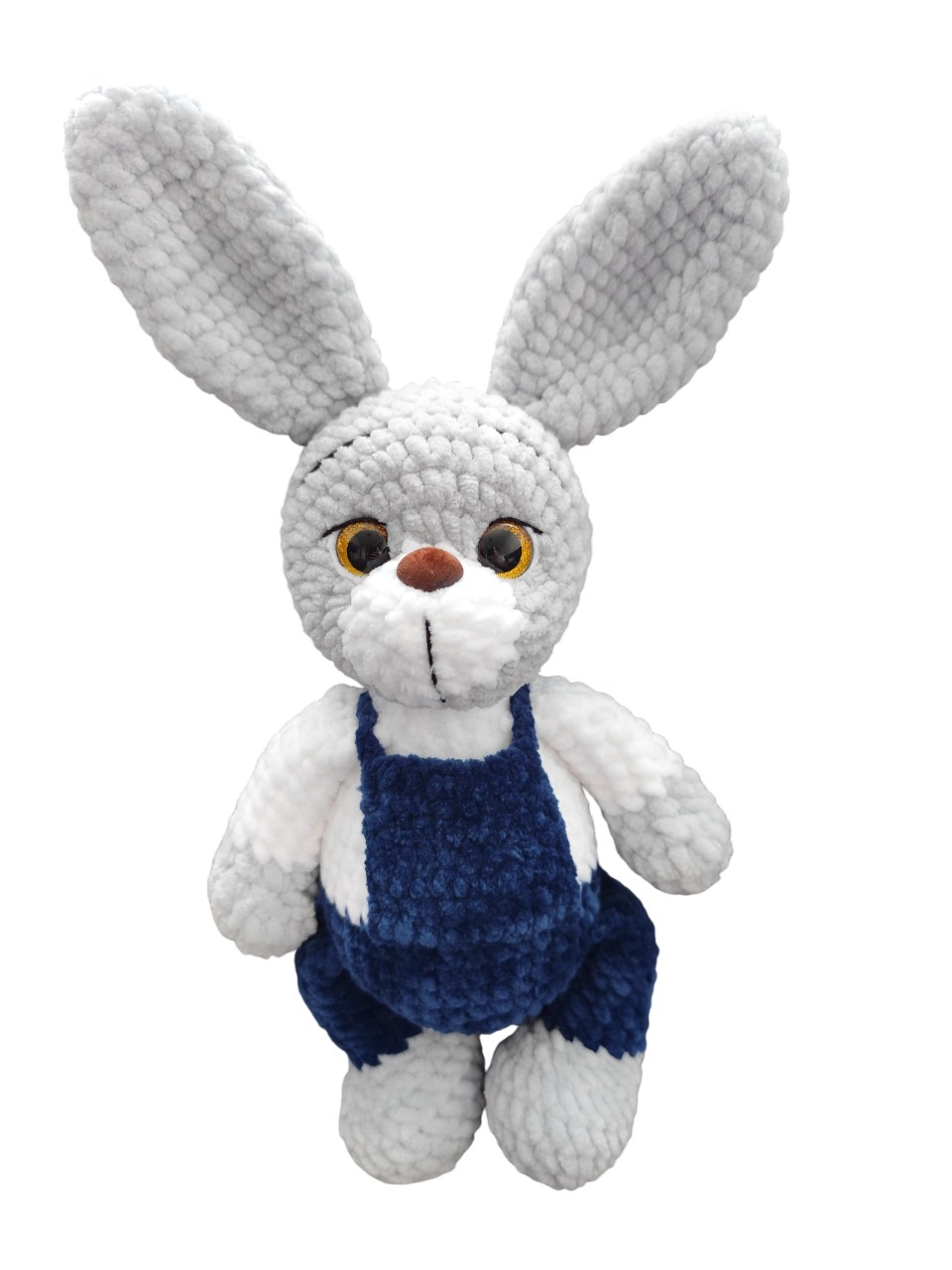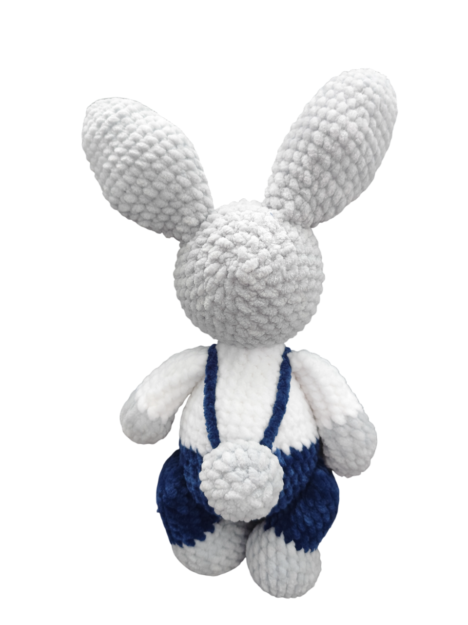 Der Hasenjunge trägt eine dunkelblaue Latzhose mit weißem Shirt und misst ca. 28 cm (mit Ohren ca. 35 cm).