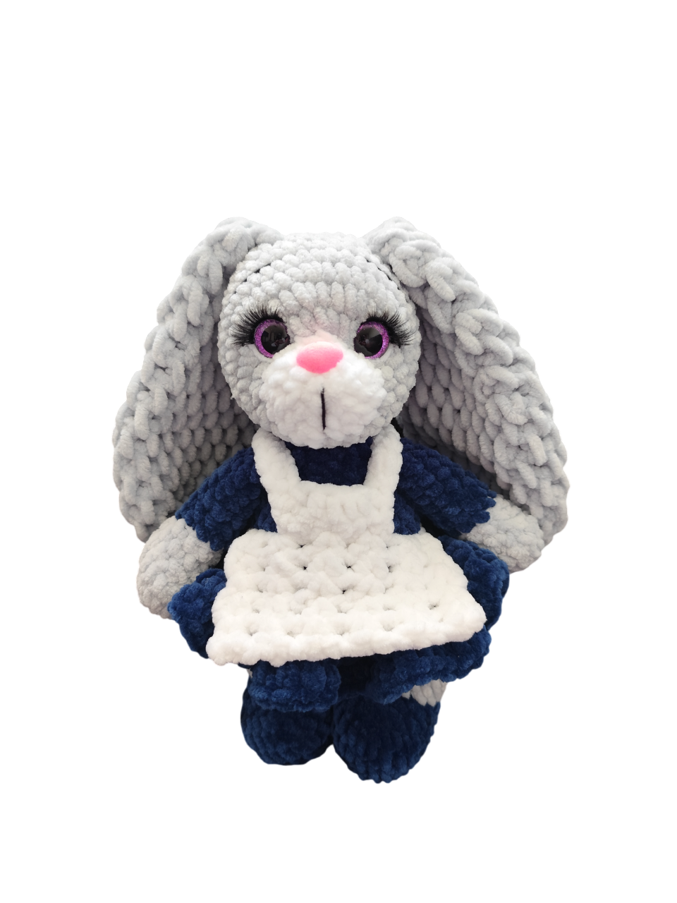 Das Hasenmädchen mit langen, hängenden Ohren trägt ein dunkelblaues Kleid mit weißer Schürze, weiße Höschen und dunkelblaue Schuhe. Besonderes Highlight: geklebte Wimpern, die ihr einen bezaubernden Ausdruck verleihen.