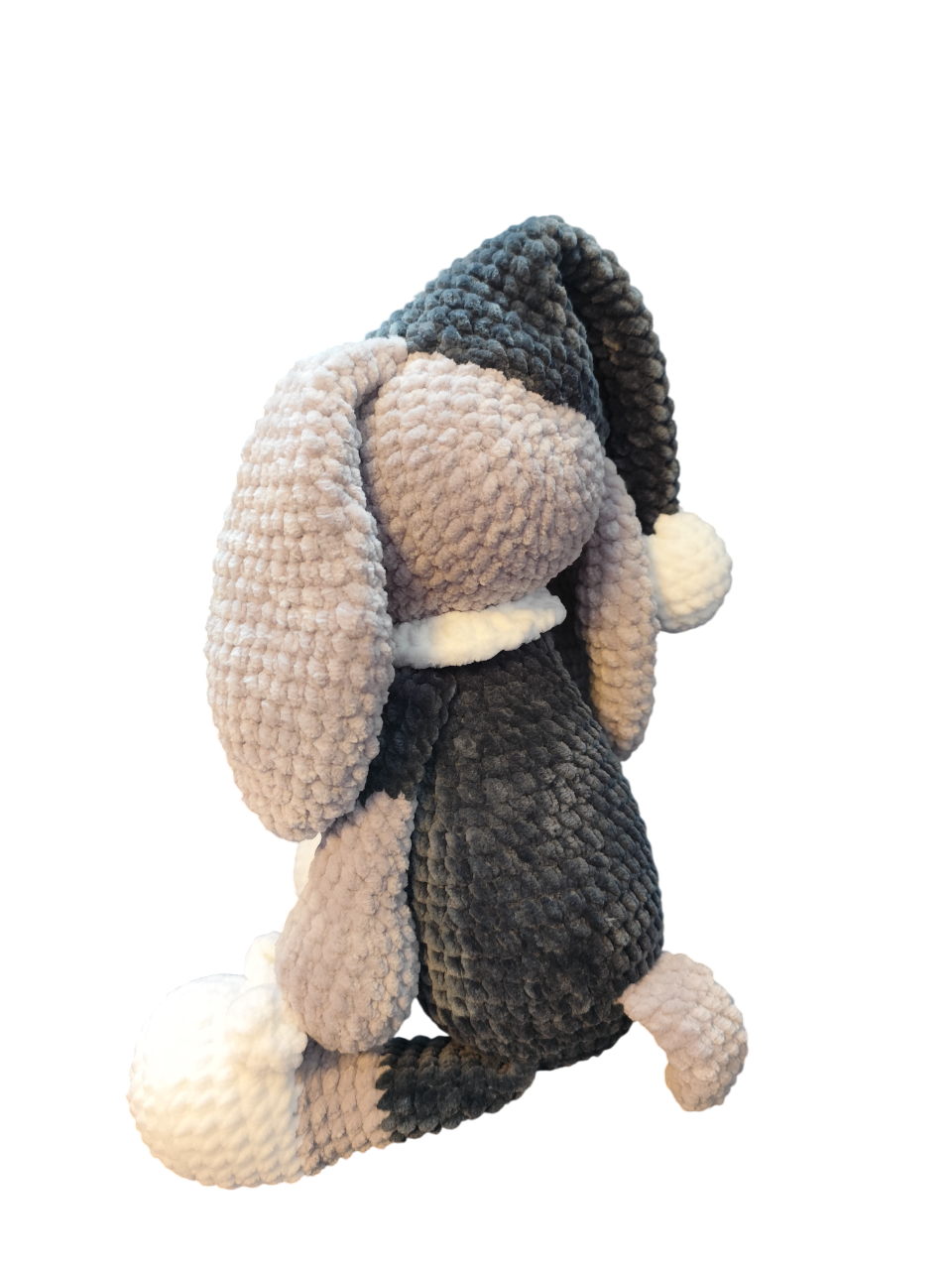 Der bezaubernde Plüschhund "Schlafender Hund mit Hut" wurde liebevoll aus hochwertiger Himalaya Dolphin Baby Wolle gefertigt. Das Material ist sowohl OEKO-TEX als auch EN 71 zertifiziert, was für höchste Sicherheit und Qualität steht. Der Hund ist etwa 35 cm groß und in einem zarten Hellgrau gehalten, mit einer weißen Schnauze, die ihm einen besonders niedlichen Ausdruck verleiht. Er trägt einen dunkelgrauen Pyjama und weiße Schuhe, was ihm einen kuscheligen und charmanten Look verleiht.