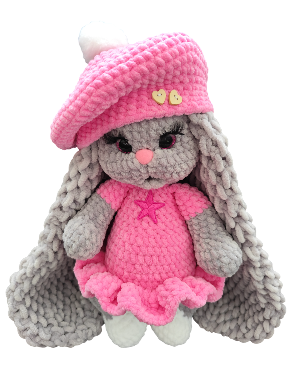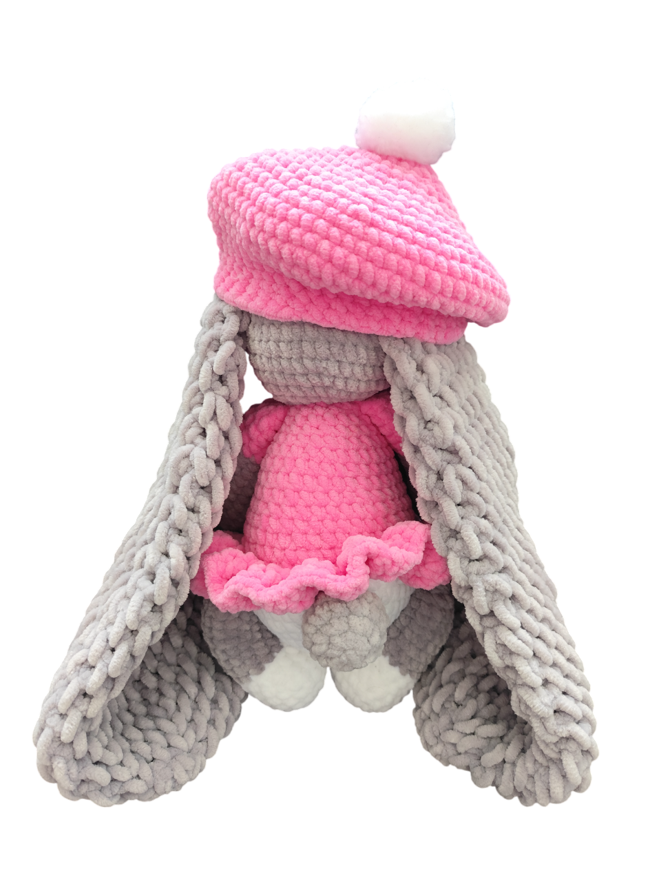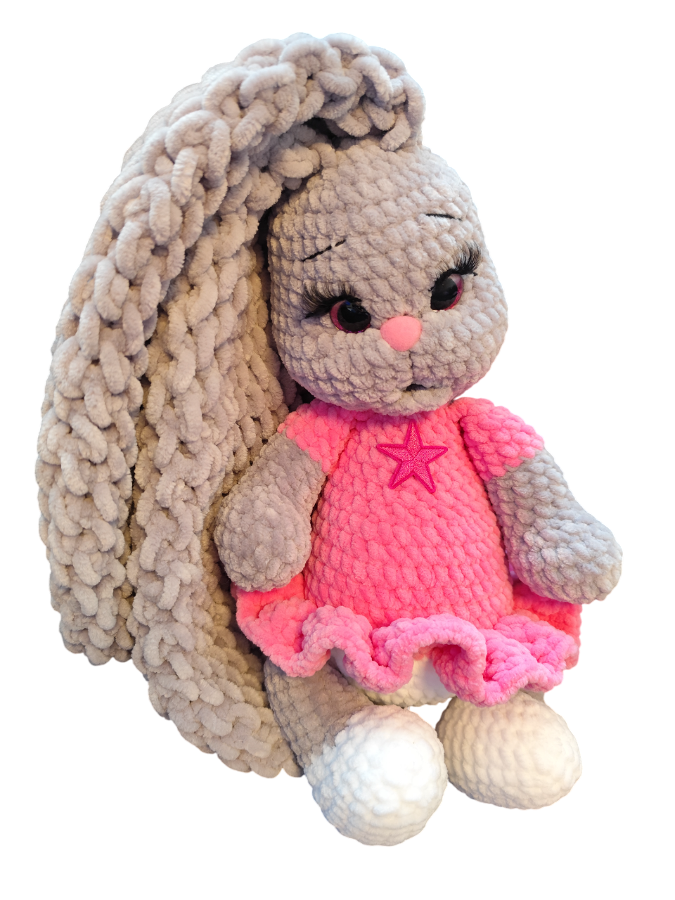 Das liebevoll handgefertigte Plüschhäschen "Mari" wurde nach der Anleitung von @mari.toys.for.you mit viel Herzblut gestaltet. Es ist etwa 30 cm groß und verfügt über bezaubernde, ca. 33 cm lange Ohren, die zum Kuscheln einladen. Das Häschen ist in einem zarten Grau gehalten, während Kleid und Mütze in einem hübschen Rosa gestaltet sind und das Häschen mit einem weißen Höschen perfekt abrunden.