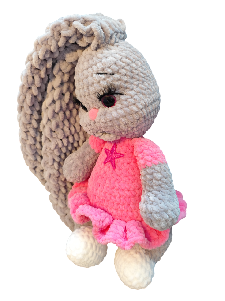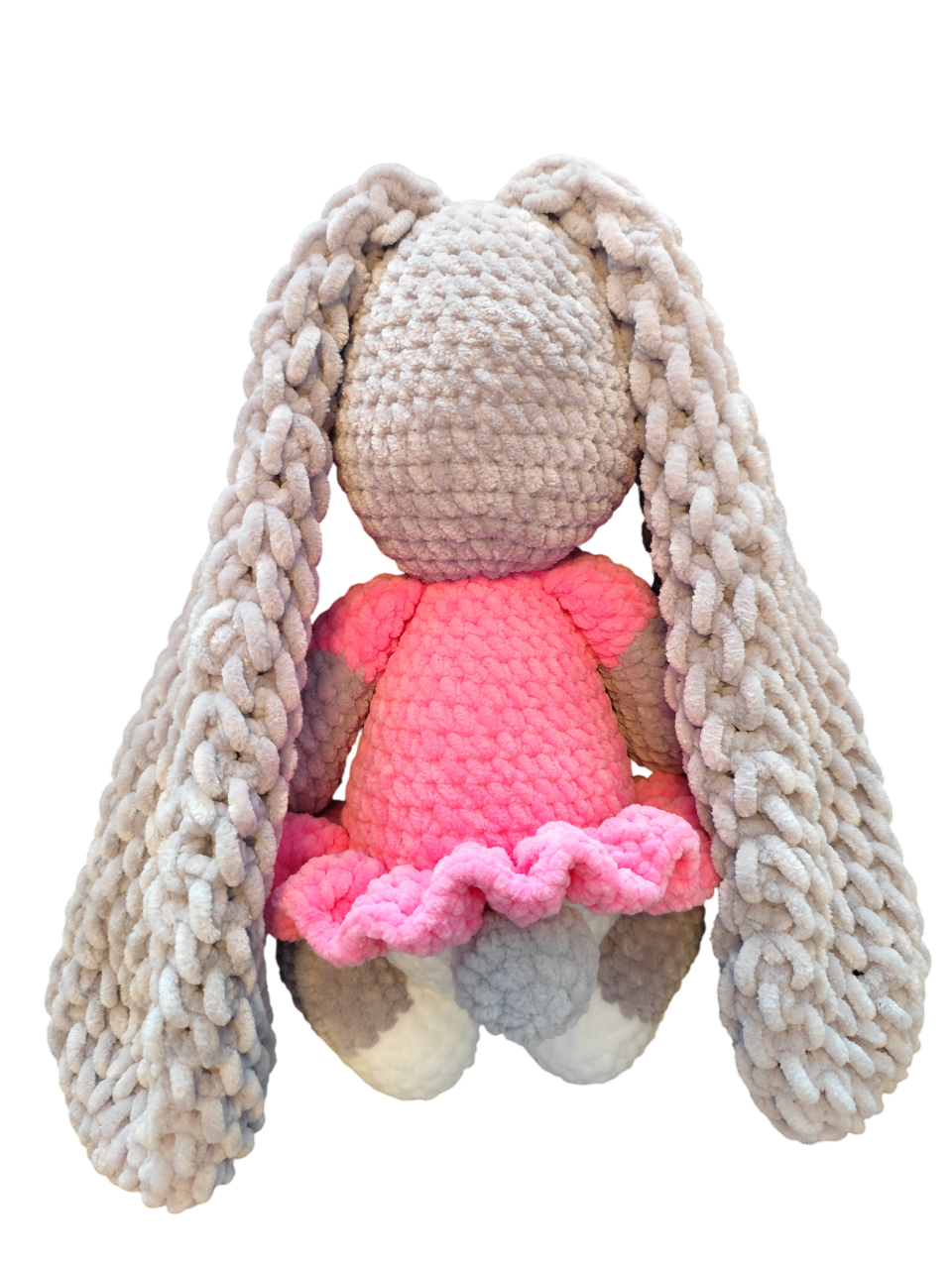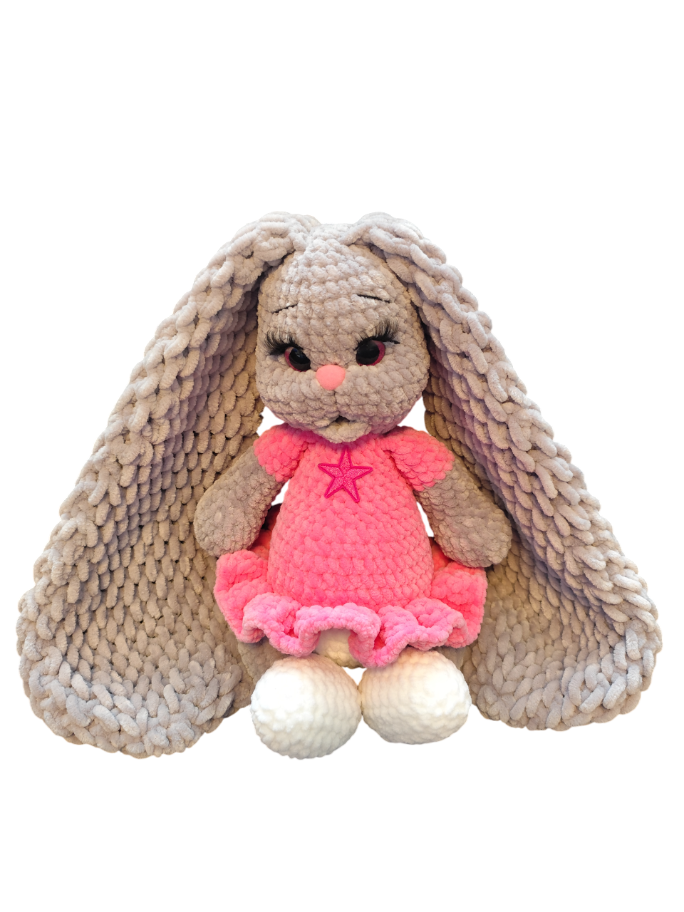 Das liebevoll handgefertigte Plüschhäschen "Mari" wurde nach der Anleitung von @mari.toys.for.you mit viel Herzblut gestaltet. Es ist etwa 30 cm groß und verfügt über bezaubernde, ca. 33 cm lange Ohren, die zum Kuscheln einladen. Das Häschen ist in einem zarten Grau gehalten, während Kleid und Mütze in einem hübschen Rosa gestaltet sind und das Häschen mit einem weißen Höschen perfekt abrunden.