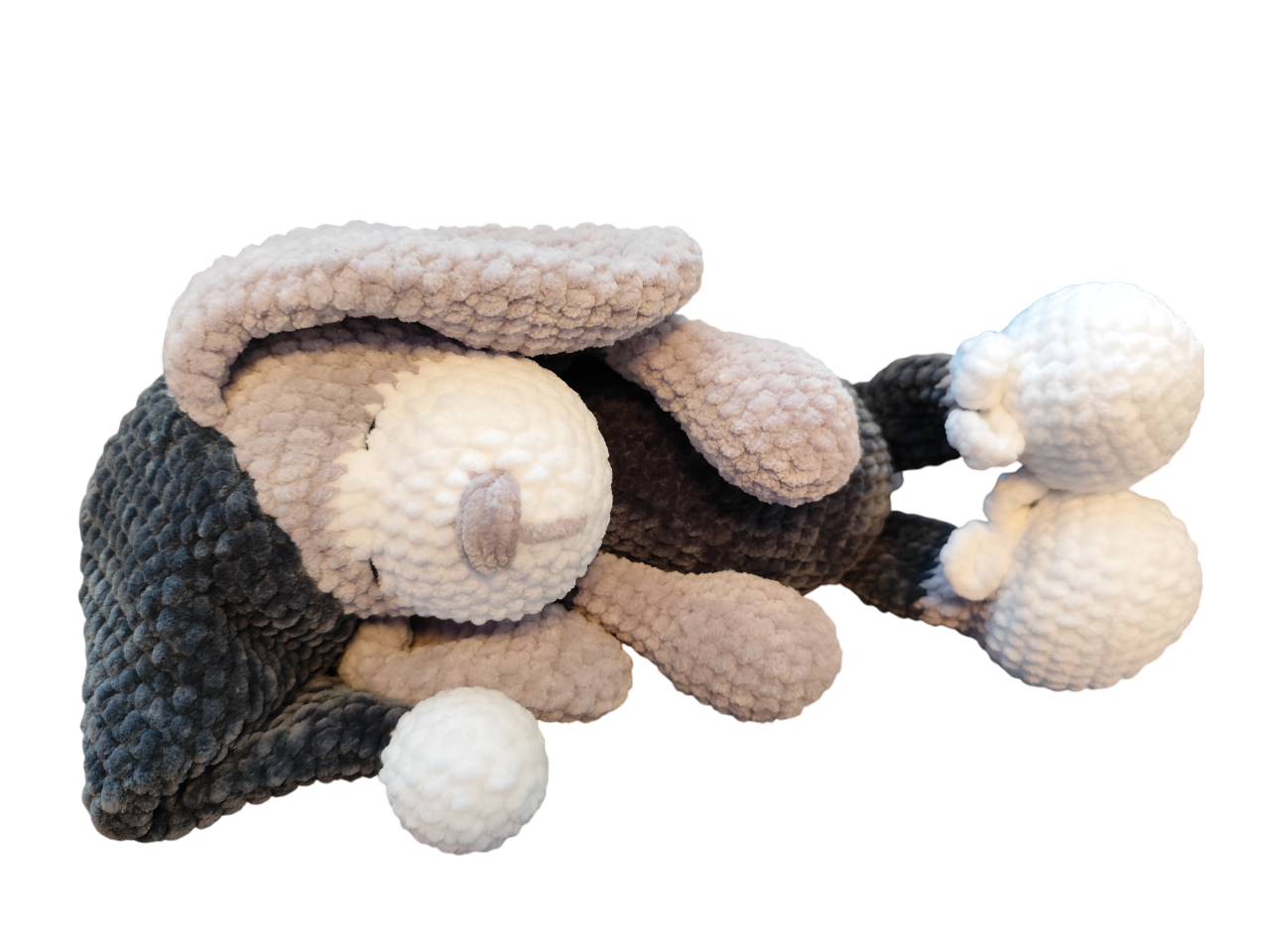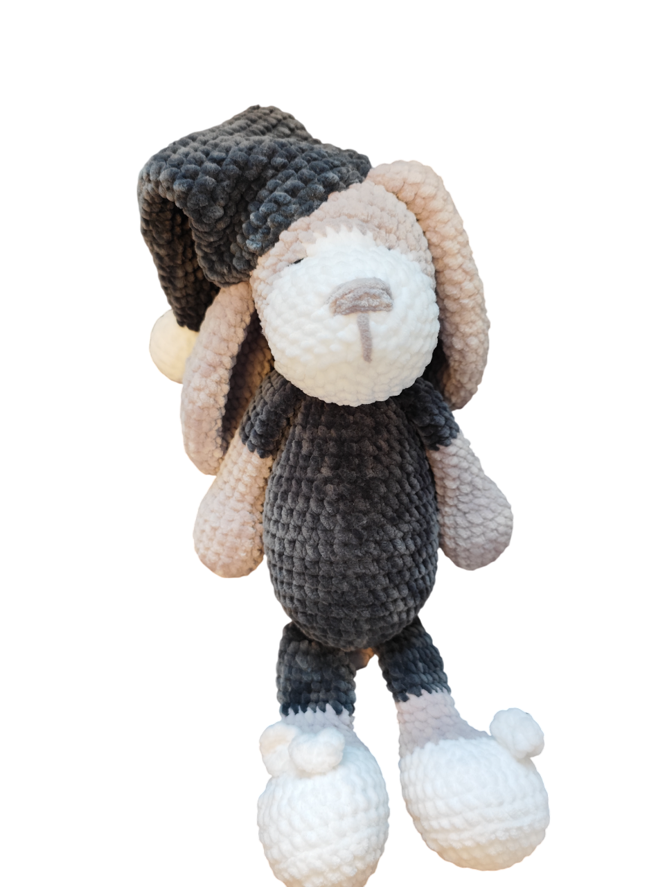 Der bezaubernde Plüschhund "Schlafender Hund mit Hut" wurde liebevoll aus hochwertiger Himalaya Dolphin Baby Wolle gefertigt. Das Material ist sowohl OEKO-TEX als auch EN 71 zertifiziert, was für höchste Sicherheit und Qualität steht. Der Hund ist etwa 35 cm groß und in einem zarten Hellgrau gehalten, mit einer weißen Schnauze, die ihm einen besonders niedlichen Ausdruck verleiht. Er trägt einen dunkelgrauen Pyjama und weiße Schuhe, was ihm einen kuscheligen und charmanten Look verleiht.